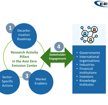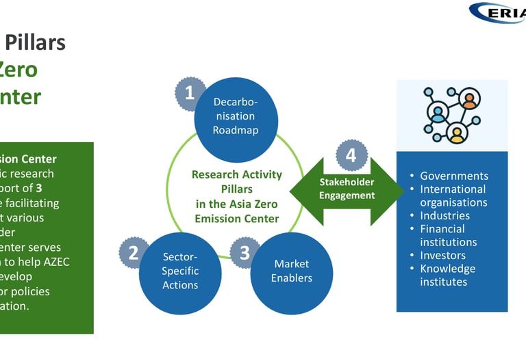 ERIA saat ini menjadi tuan rumah bagi Asia Zero Emission Center (AZEC), sebuah kerangka kerja sama antarnegara di Asia yang bertujuan mencapai tiga hal sekaligus: menekan emisi karbon, menjaga pertumbuhan ekonomi, dan menjamin keamanan energi. AZEC menekankan prinsip “One Goal, Various Pathways” yang artinya setiap negara bisa menempuh jalur berbeda menuju dekarbonisasi sesuai dengan kondisi geografis, sosial, dan ekonominya.